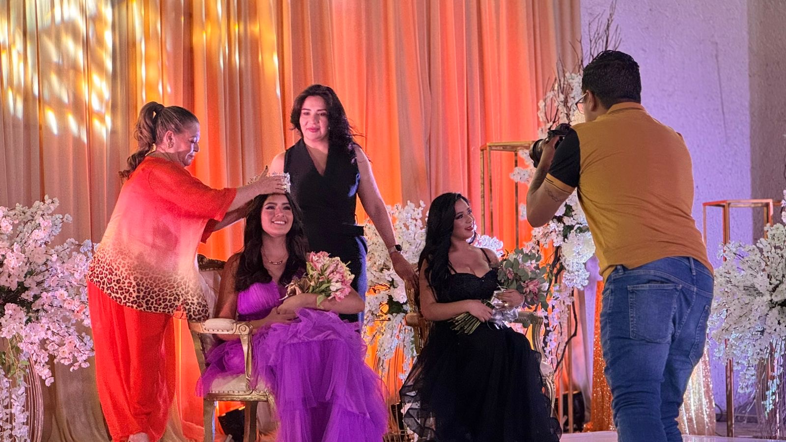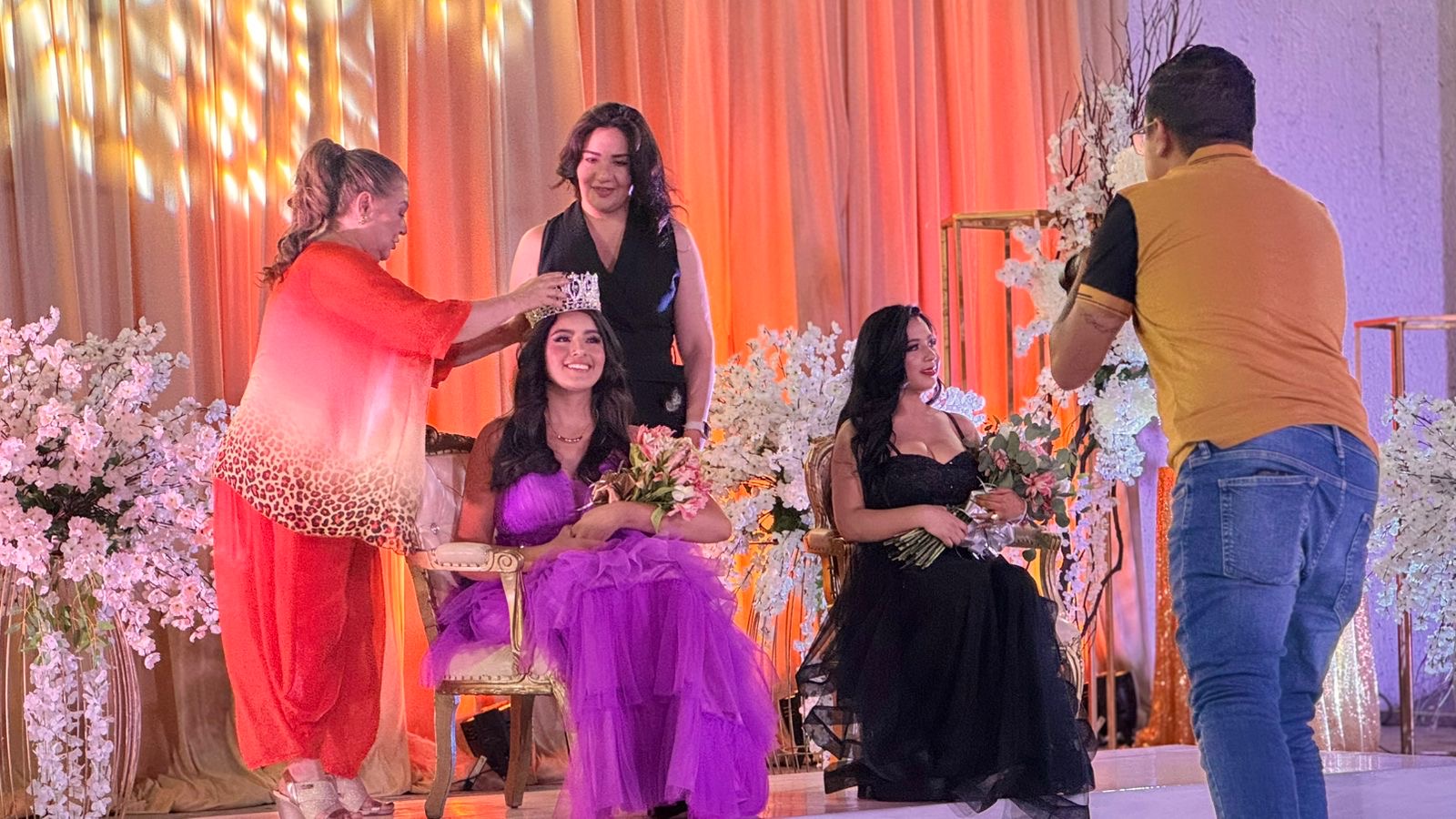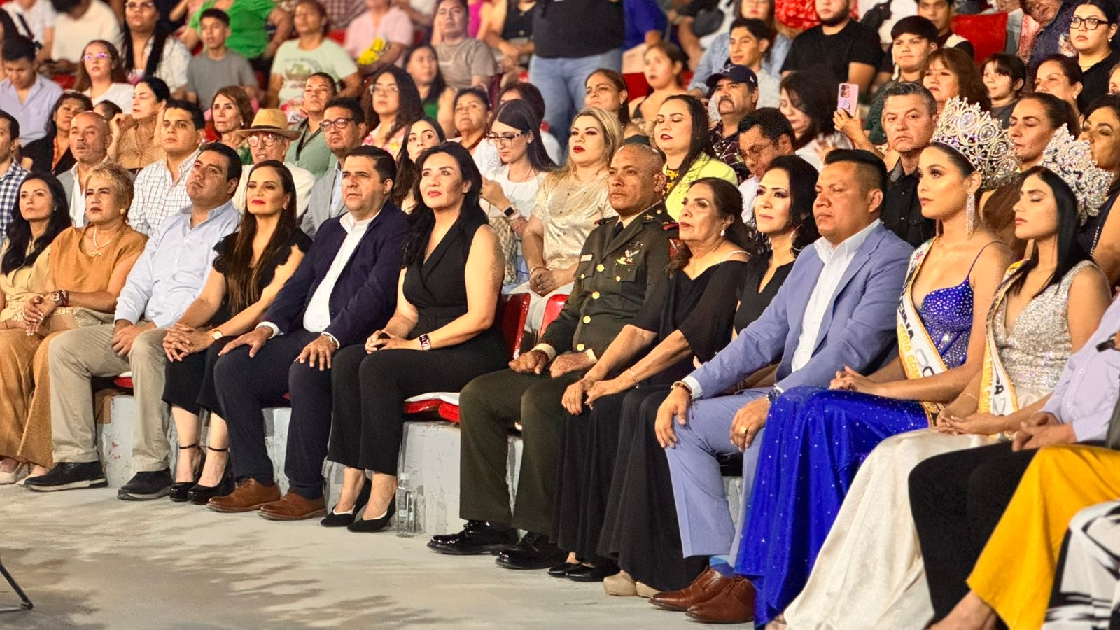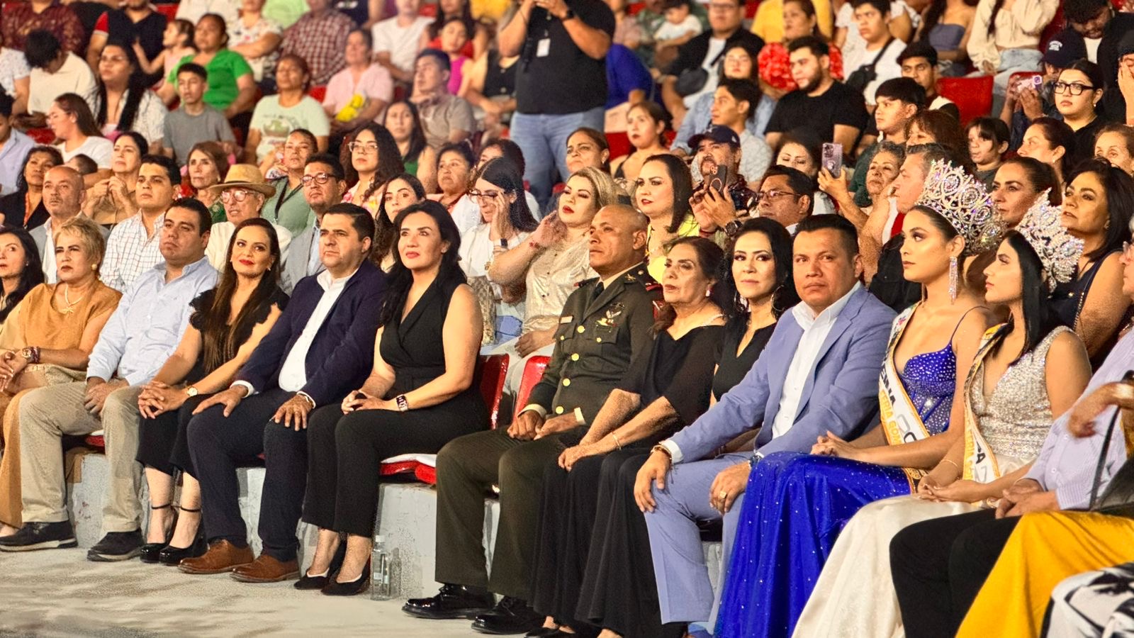 Posteriormente, el Teatro del Pueblo fue el escenario de la esperada ceremonia de coronación. La alcaldesa Leticia Herrera Ale coronó a Evelyn Aymar Rentería Gavira como la Reina de la Feria, mientras que Ana Rosa Hernández, en representación del Gobernador, colocó la corona a Denis Janet González Domínguez como Princesa.