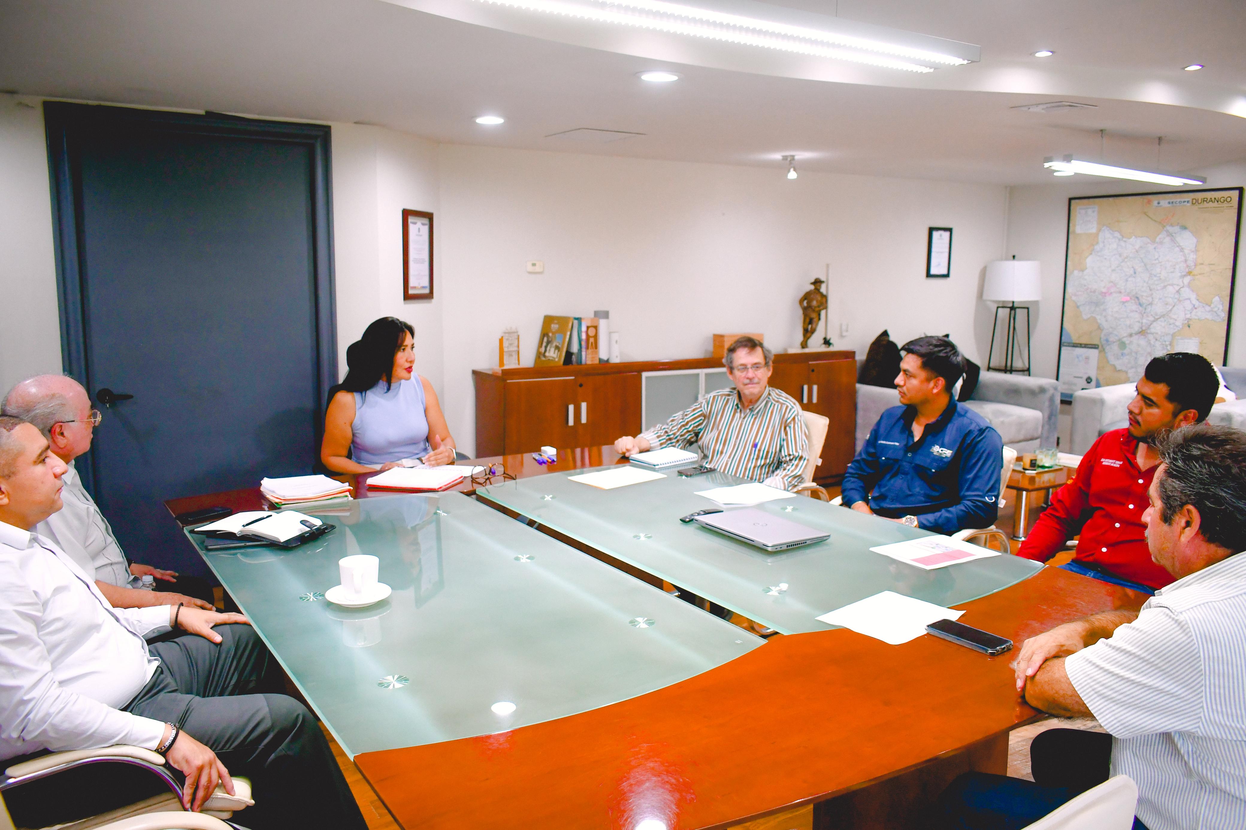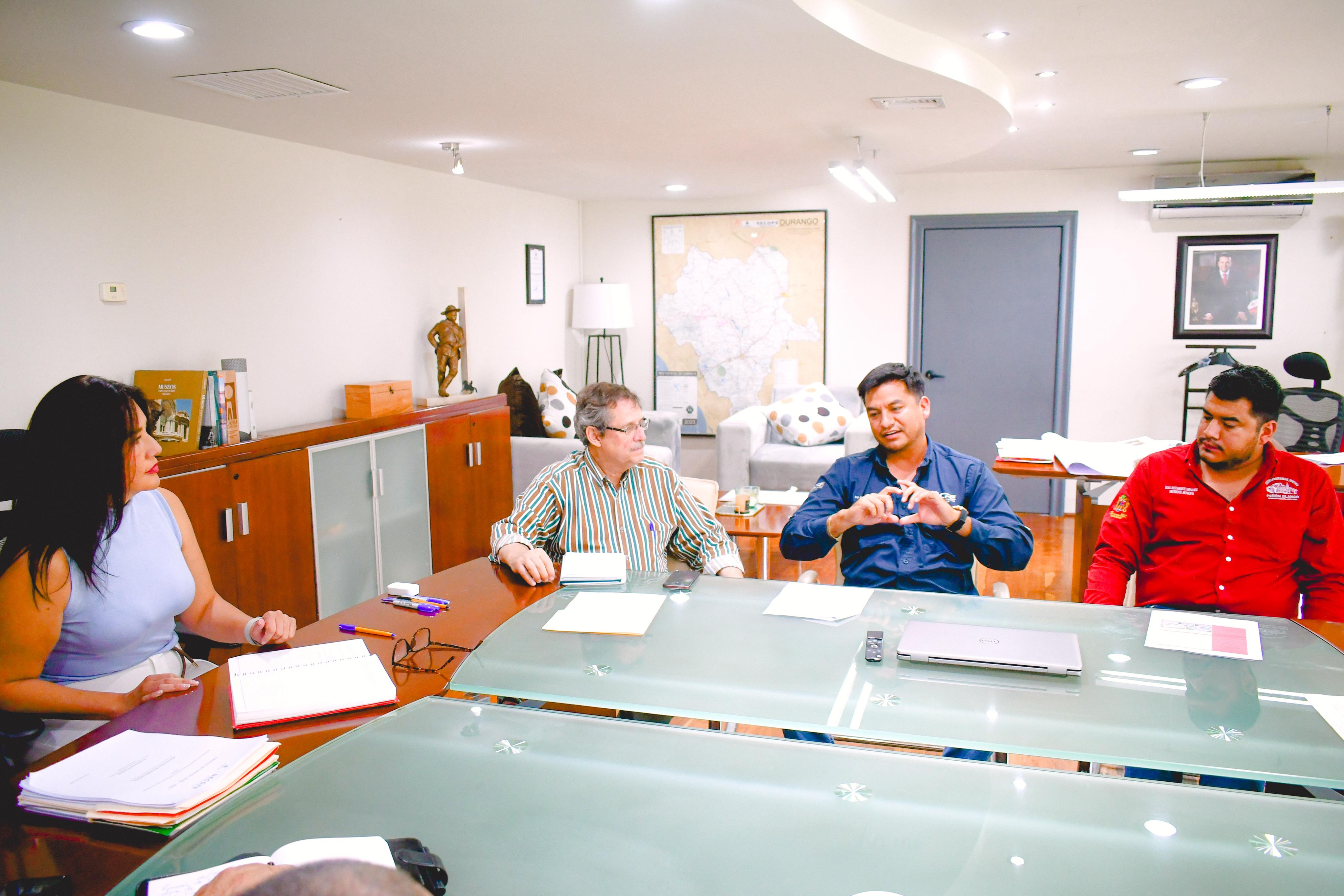 Durango, Dgo.- En un esfuerzo por garantizar vías de comunicación seguras y eficientes, la titular de la Secretaría de Comunicaciones y Obras Públicas del Estado (SECOPE), Ana Rosa Hernández Rentería, sostuvo una reunión de trabajo con el presidente municipal de Peñón Blanco, Elías Bustamante Hernández, y el director del Centro de la Secretaría de Infraestructura, Comunicaciones y Transportes (SICT) en Durango, Ángel Sergio Devora Núñez.